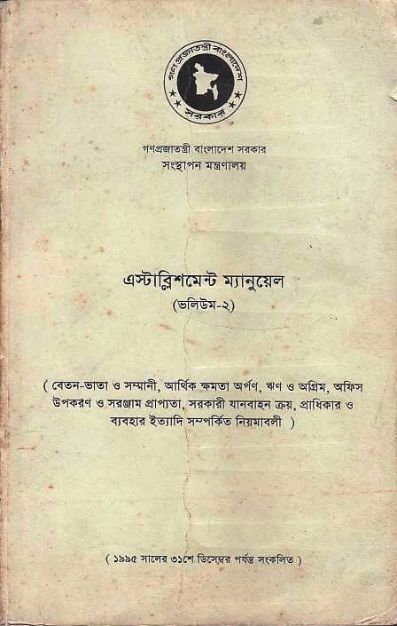 এস্টাব্লিশমেন্ট ম্যানুয়েল: বেতন-ভাতা ও সম্মানী, আর্থিক ক্ষমতা অর্পণ, ঋণ ও অগ্রিম, অফিস উপকরণ ও সরঞ্জাম প্রাপ্যতা, সরকারি যানবাহন ক্রয়, প্রাধিকার ও ব্যবহার ইত্যাদি সম্পর্কিত নিয়মাবলী/