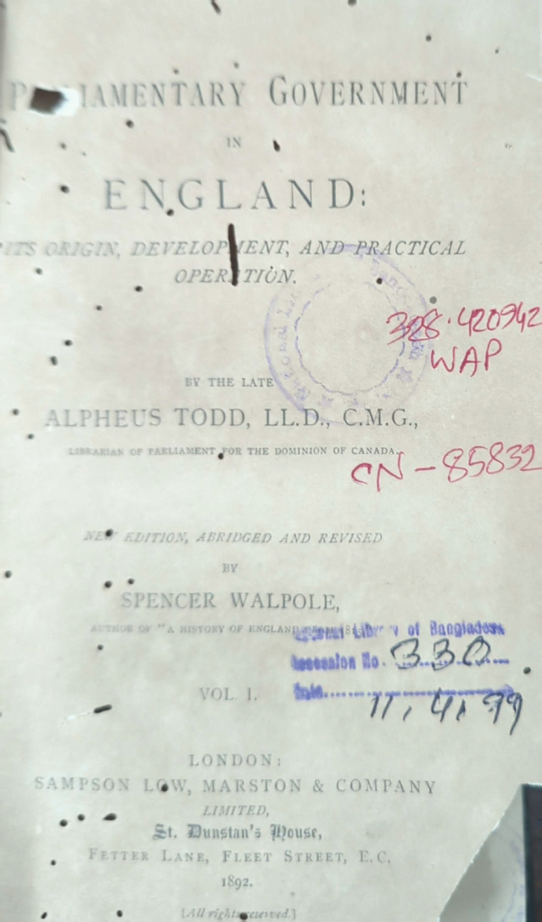| 328.1 ABM. minutes of the seneate/ | 328.41 Parliament Past and Present/ | 328.42005 JOU JOURNAL OF THE PARLIAMENTS OF THE EMPIRE / | 328.420942 WAP Parliament Government in England / | 328.420954 DEB Debates on Indian Affairs (House of Lords / The Parliamentary Debates) / | 328.54 Council Proceedings Official Report: Bengal Legislative Council/ | 328.54 BEN Bengal Legislative Council Proceedings / |