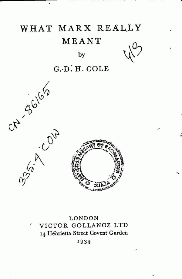 | 333.31 TAB Table of Contents: Districts of Darjiling and Jalpaiguri/ | ৩৩৪.৫৪৯২ পপদ। দ্বিতীয় পঞ্চবার্ষিকী পরিকল্পনার দ্বিতীয় বর্ষ/ | 335 STH The theory and practice of socialism / | 335.4 COW WHAT MARX REALLY MEANT / | 335.4 FOC Communism and a Changing Civilisation / | 335.4 MAC Capital : A critique of political Economy / | 335.4 MAR Marxist Miscellany / |