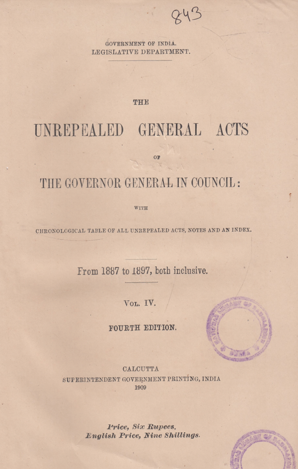 | 347.54052 LAA All India civil court manual / | 348.5402UNR Unrepealed General Acts: The Governor General in Council (1898-1903)/ | 348 COL A Collection of Statutes relating to India/ | 348 UNR. The unrepealed general acts of the governor general in council/ | 348.0954 GEN. General rules and orders: British India/ | 348.540 GVT The Unrepealed General Acts of the Governor General Council / | 348.54 LAW. Laws and regulations/ |